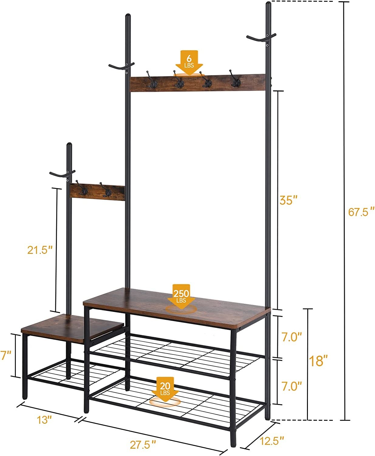 1+1 Hall Tree Coat Rack, Sturdy Parent-Child Entryway Bench and Shoe Rack Storage, 3-in-1 Functional Hall Tree Industrial Rustic Wood Metal Furniture for