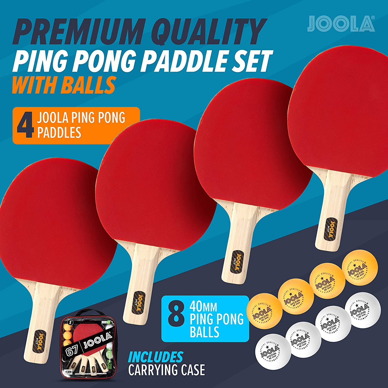 • PREMIUM QUALITY PING PONG PADDLE SET WITH BALLS: This ping pong racket set includes everything needed to play table tennis. Includes 4 JOOLA ping pong paddles, 4 White and 4 Orange Ping Pong Balls for competitive play, along with a carrying case.