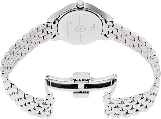 The white dial is enhanced by silver hands. Silver stainless steel case with silver stainless steel strap. Quartz movement. Water resistant to 30 meters/100 feet. Fixed bezel. Scratch resistant sapphire crystal. Solid caseback. Deploy using button buckles. Pull/push crown. Case dimensions 27mm x 7.73mm. With 12mm x length. Tissot T103.110.11.033.00 Bella Ora watch.