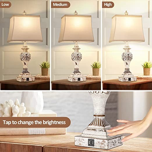 Touch Console Lights Set of 2, 3-Way Dimmable Bedside Lamp with Dual USB Charging Ports, Modern White Bedside Table Lamp for Living Room Bedroom, Bulb Included